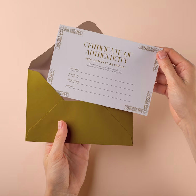 Nous utilisons des certificats d'authenticité pour garantir l'unicité de nos œuvres et de nos reproductions. Chaque certificat est un document sécurisé avec un filigrane, des fibres fluorescentes et un hologramme numéroté, assurant ainsi qu'il est associé à une seule œuvre. Cette pratique renforce la confiance des acheteurs dans l'authenticité de nos œuvres et prévient la contrefaçon dans le marché de l'art.